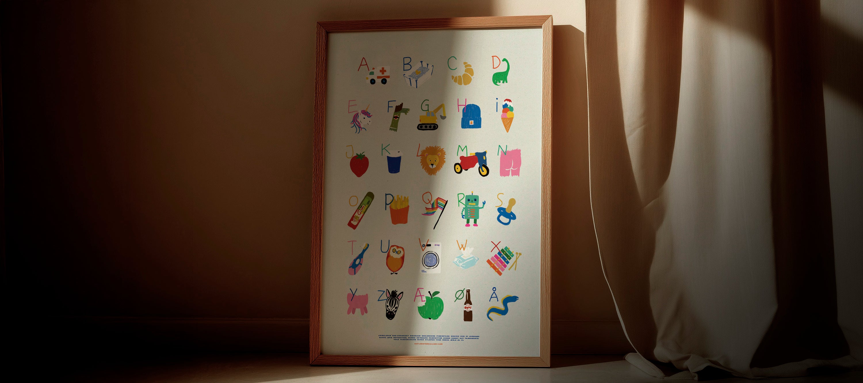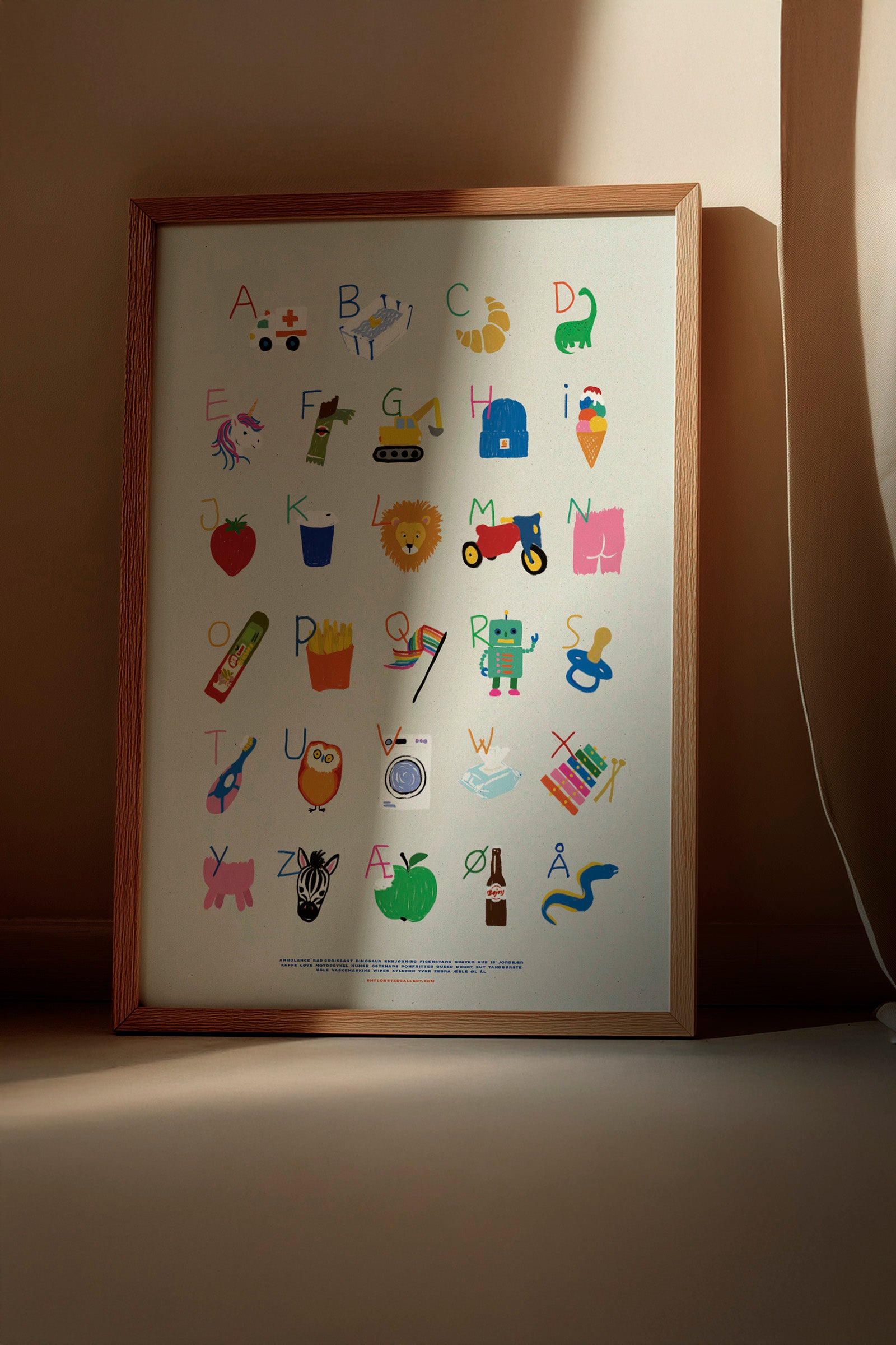Vores topsælger nr. 1 er uden tvivl denne lille perle. Den eneste alfabetplakat, der får dig til at smile ;)